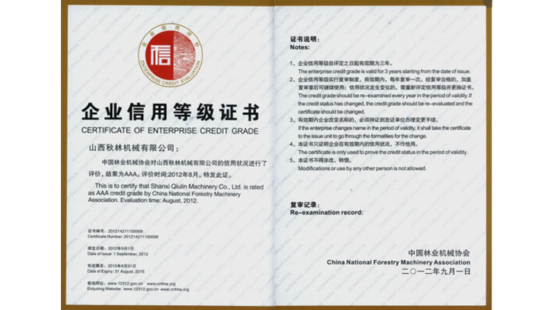 We were awarded AAA grade certificate of enterprise credit grade from China National Forestry Machinery Association in 2012.
